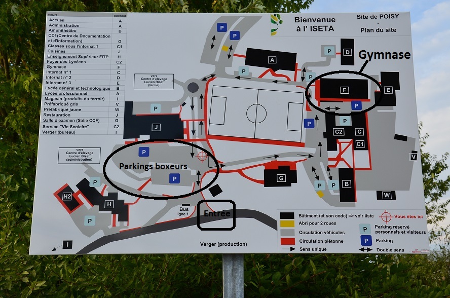 A l'entrée de l'ISETA au 855 Route de l'École d'Agriculture Poisy.(cliquez sur l'adresse), il faut vous garer sur les parkings situés sur la gauche et ensuite, rejoindre à pied le gymnase en longeant le terrain de foot.(cliquez sur la photo à droite pour agrandir le plan)