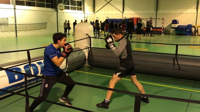 Dans le cadre de la préparation du premier combat de notre jeune Zakari Bellal (maillot bleu) samedi soir au gala d’ALBERTVILLE (hors compétition), nous avons testé un ring gonflable dans le gymnase, et c’est l’expérimenté Kevin Keraghel qui sert de sparring pour Zakari.